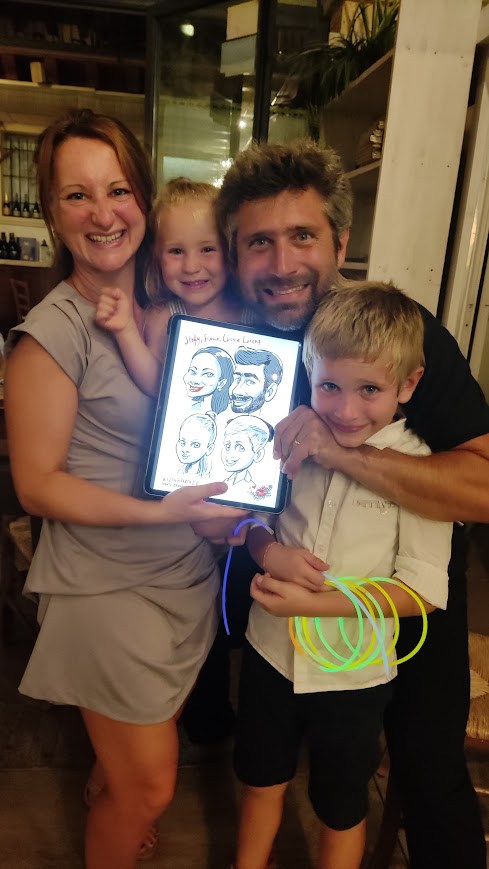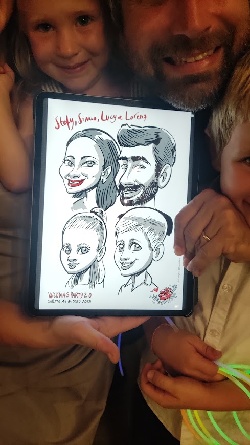 «¡¡Un regalo muy original y fantástico de los recién casados a sus amigos invitados!! ¡Valentina nos hizo una caricatura muy divertida y bonita de una familia! Súper buena y profesional, sabe captar las expresiones de las personas de manera real y resaltar los detalles del rostro!! ¡¡Una experiencia realmente agradable!!»
