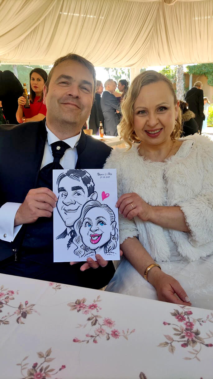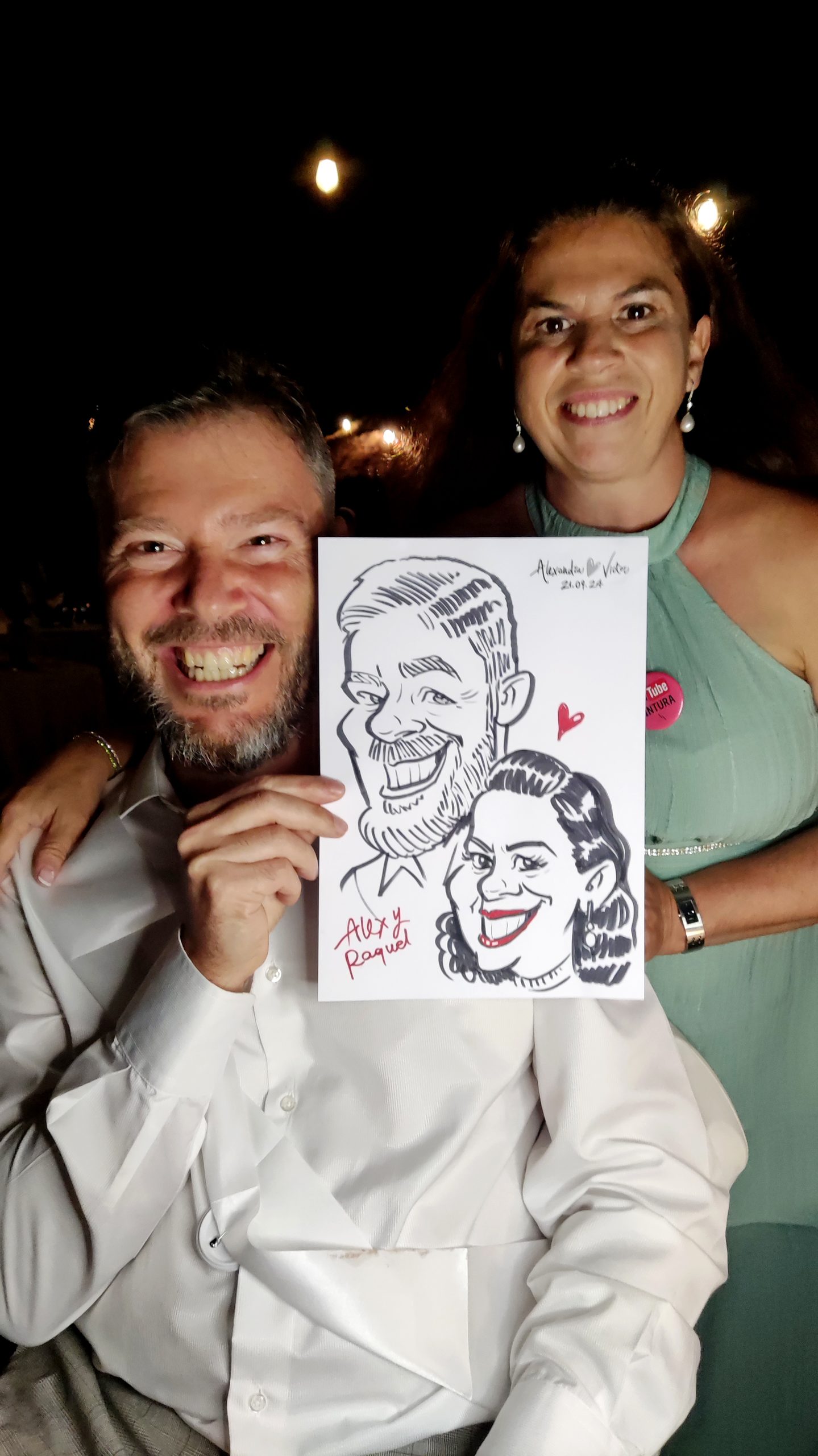 «Para nosotros fue una idea fresca y original. A los invitados les encantó la idea de llevarse un buen recuerdo en forma de caricatura. Valentina es un encanto. Capta con gran talento la esencia de las personas que dibuja. Todo un acierto en nuestro gran día.»