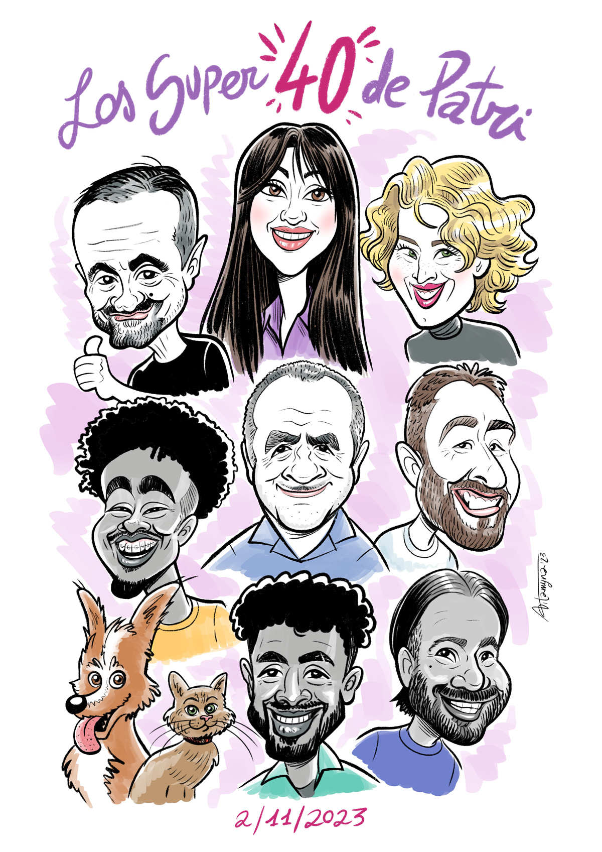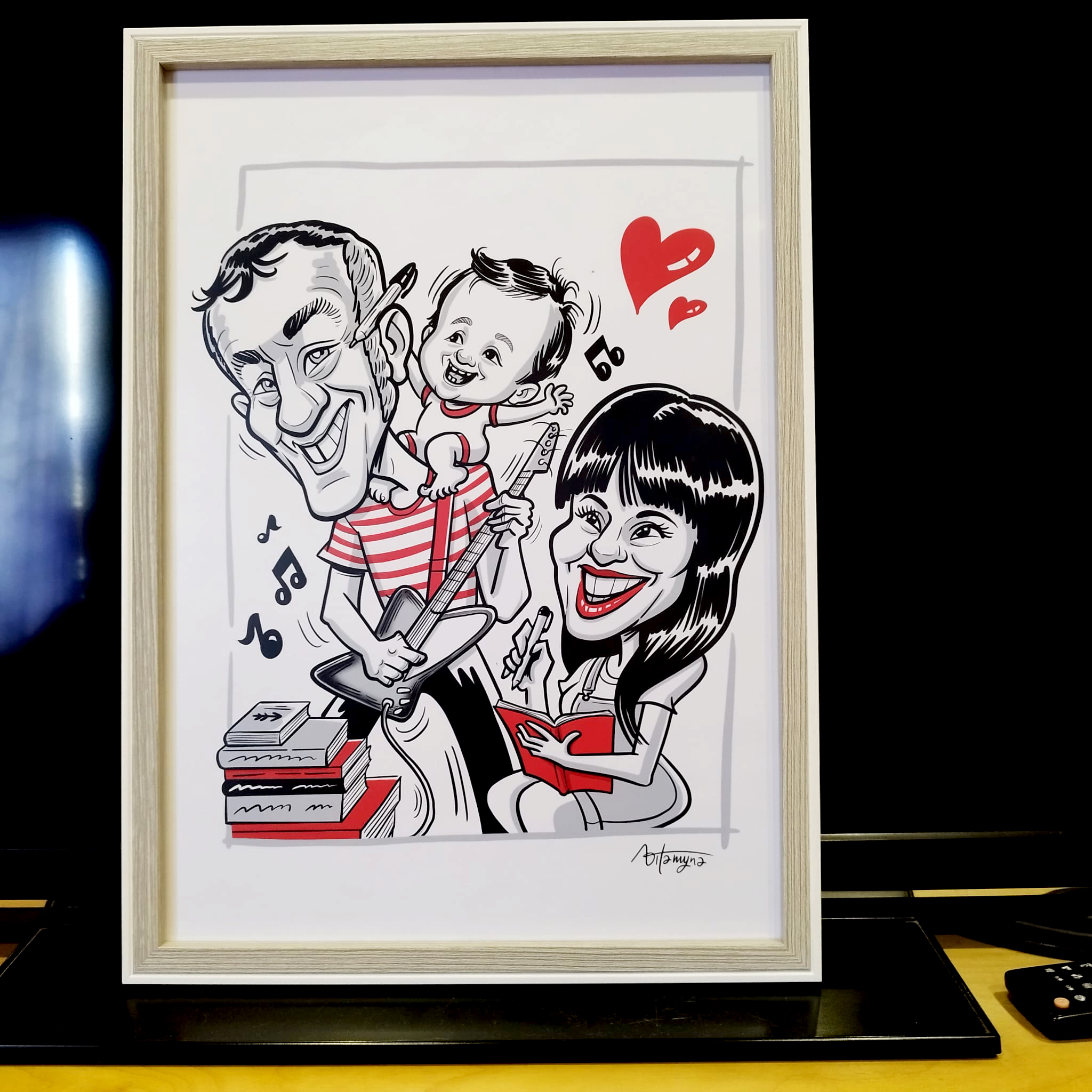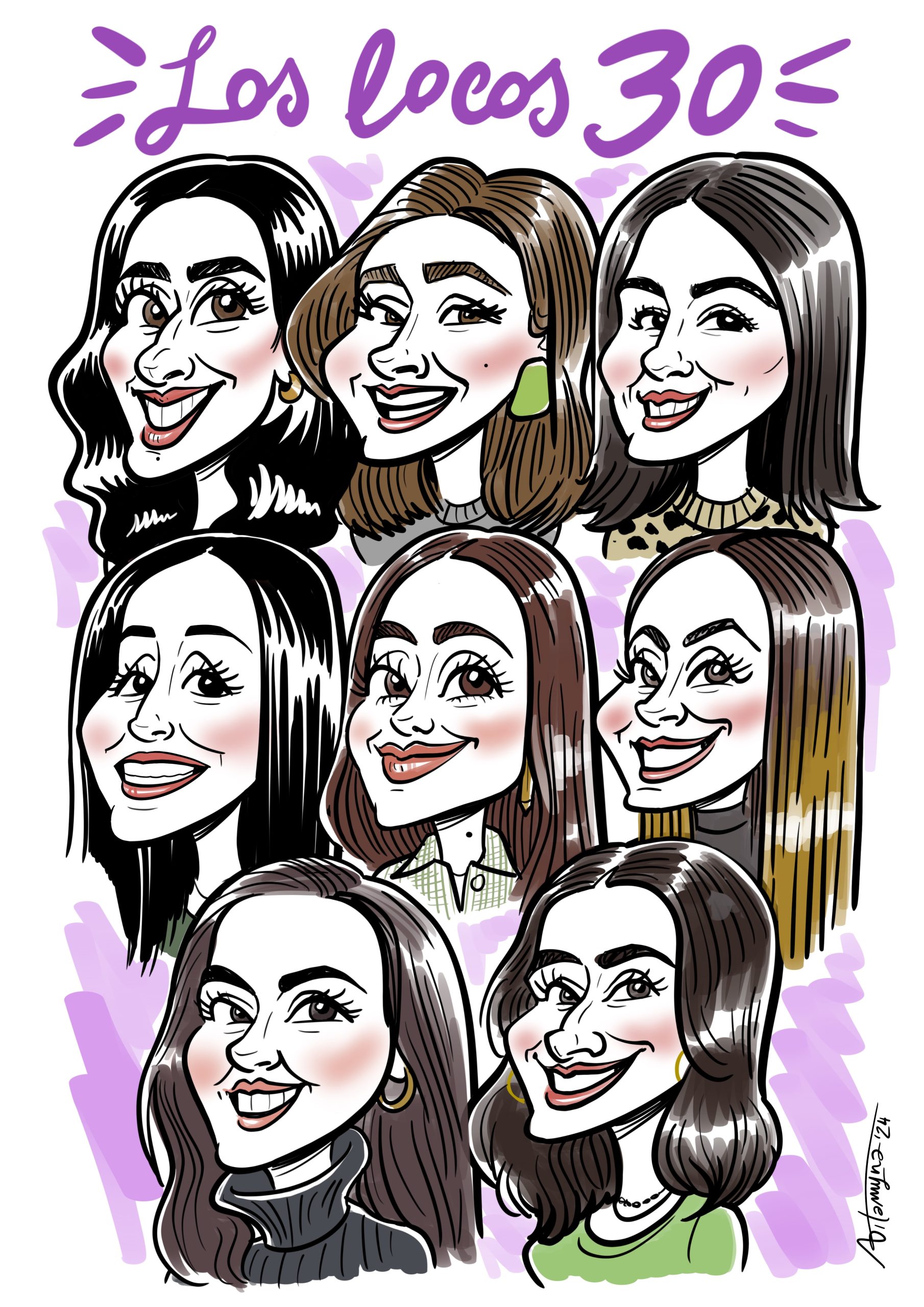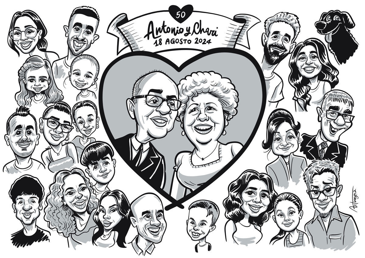 Bring your memories to life with colored caricatures. This vibrant, detailed style captures the essence of each person, infusing energy and creating a piece that will not go unnoticed.