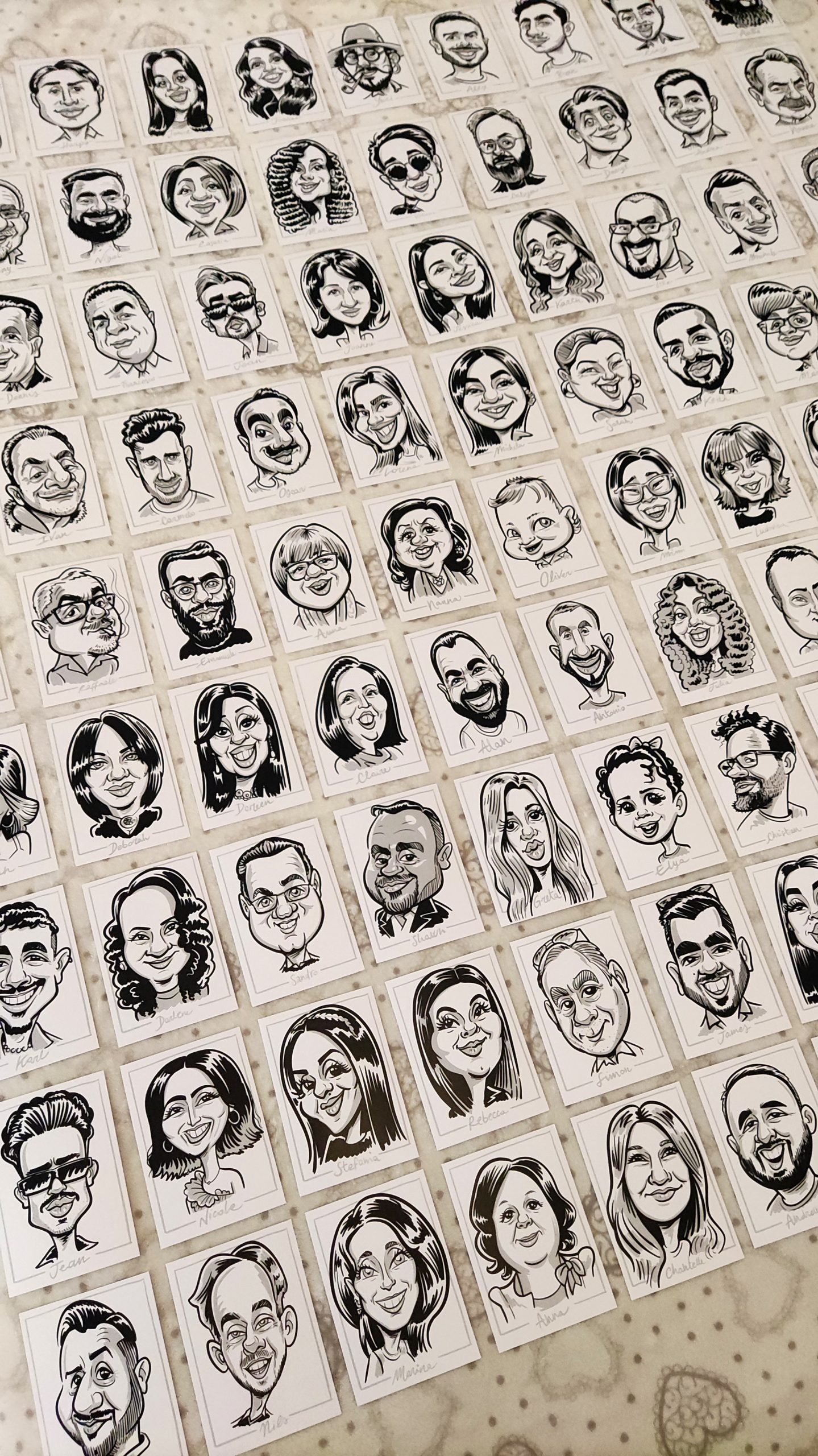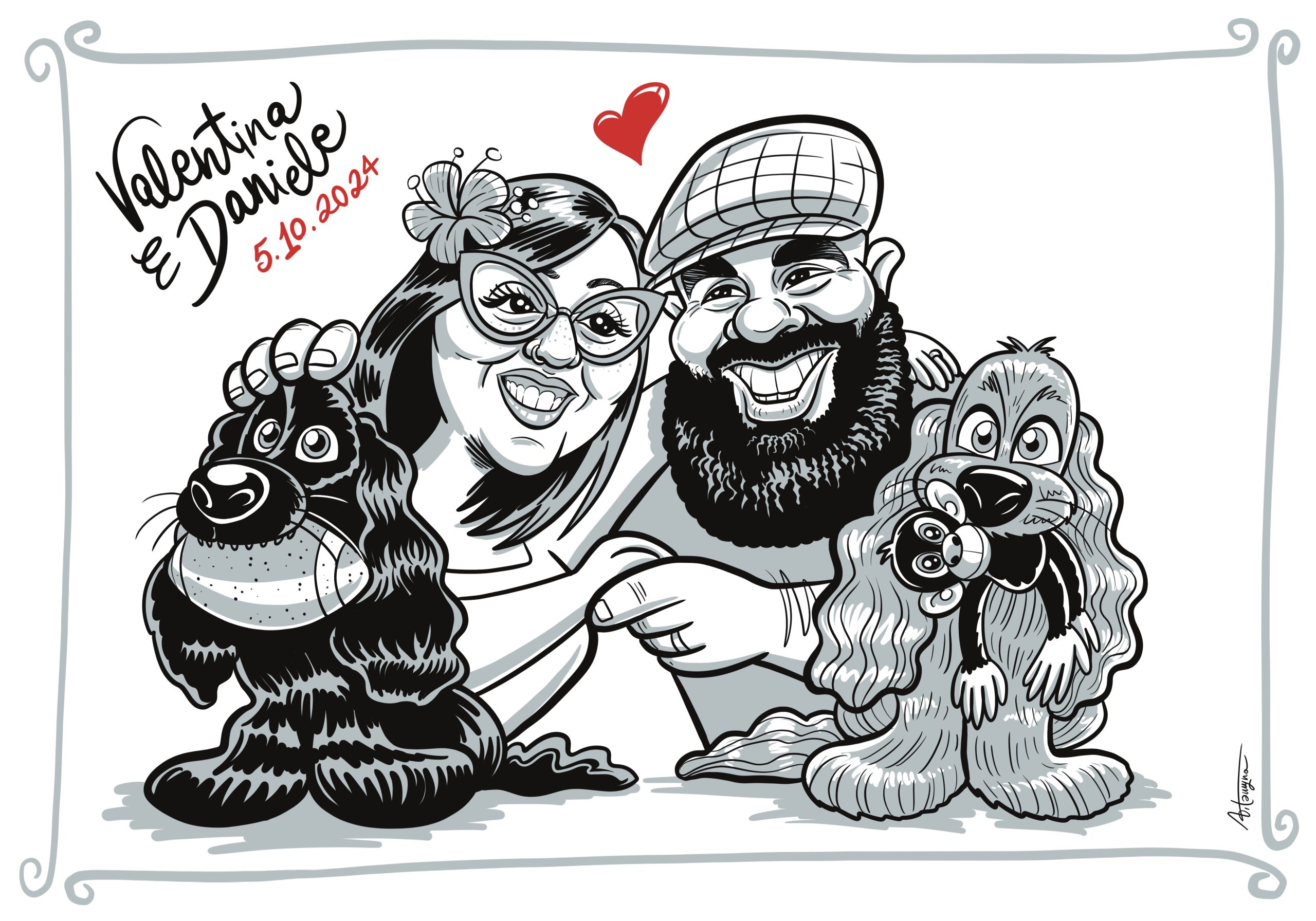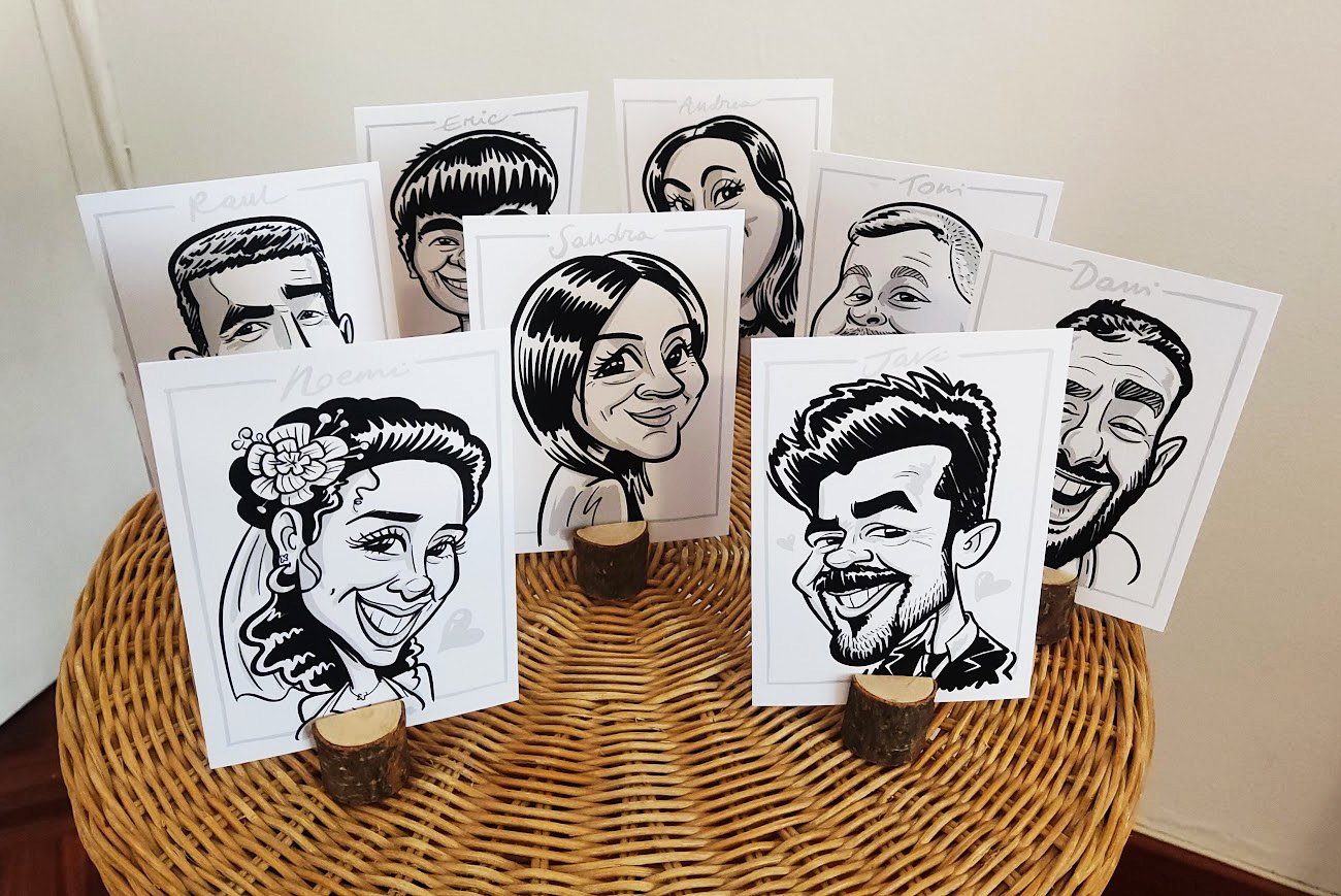 As a caricaturist and graphic designer, I can create unique wedding invitations, seating plans, special posters or cutouts with caricatures of the couple, and even personalized place cards with caricatures of all the guests, adding an original and fun touch to every detail of your event.